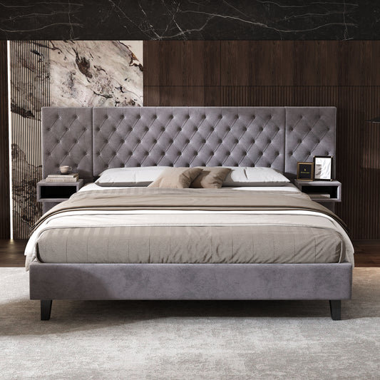King Size Platform Bed with Headboard, Modern Velvet Upholstered Platform Bed with 2 Nightstands, with diamond tufted, Grey