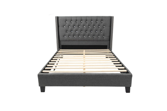 Queen Size Bed Frame with LED, 4 Under-bed Portable Storage Drawers, Wings Headboard Design, Dark Grey