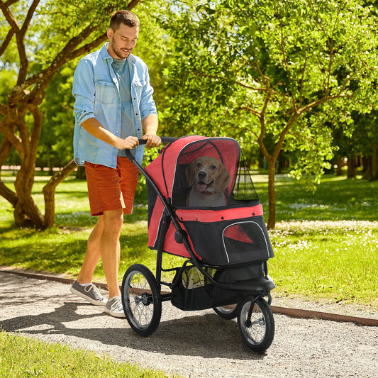 PawHut Pet Stroller for Small and Medium Dogs, 3 Big Wheels Foldable Cat Stroller with Adjustable Canopy, Safety Tether, Storage Basket, Red