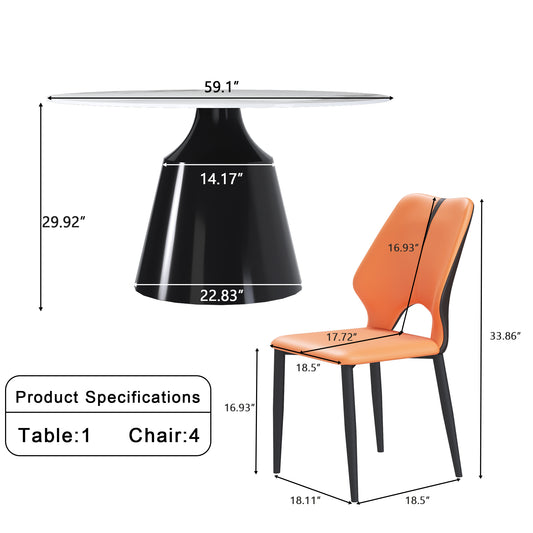 53' Marble Round Dining Table, Sintered Stone Round Dining Table with Stainless Steel Cone Base, Sturdy Dining Table for Kitchen Dining Room for 4-6 people (with 4 Orange Chairs)