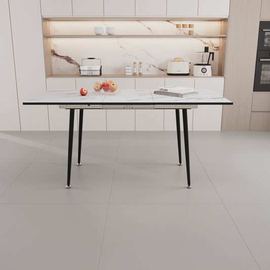 47" expandable to 63" inch MDF square white marble patterned dining table, modern industrial kitchen and dining table, equipped with tapered black metal legs