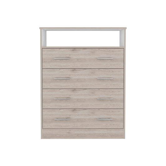 Peru L Four Drawer Dresser, Superior Top, One Open Shelf -Light Gray / White