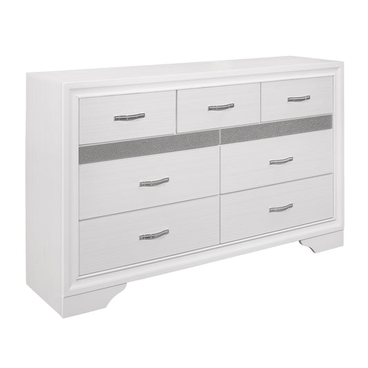 Modern Glam Dresser of 7 Drawers White and Silver Glitter Hidden Jewelry Drawers Ball Bearing Glides Modern Wooden Bedroom Furniture