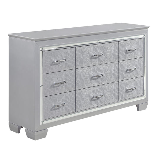 Modern Glam Silver Finish 1pc Nine Drawers Dresser Faux Alligator Textured Drawers Fronts Faux Crystals Wooden Bedroom Furniture