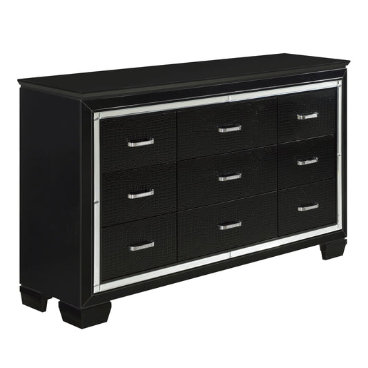 Black Finish Dresser Bold Desing 9 Drawers Glamorous Faux-Alligator Textured Fronts Wooden Bedroom Furniture