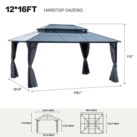 12' x 16' Gazebo Polycarbonate Double Roof Canopy Outdoor Aluminum Frame Pergola, Permanent Pavilion with Netting and Curtains for Garden Patio Lawns Parties