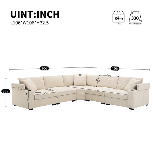 106" Convertible L Shaped Sectional Sofa,Corduroy Corner Couch with Armrest Storage,Cup Holders,USB Charger,Irregular Corner,Oversized Comfy Modular Sofa for Living Room,Apartment,2 Colors