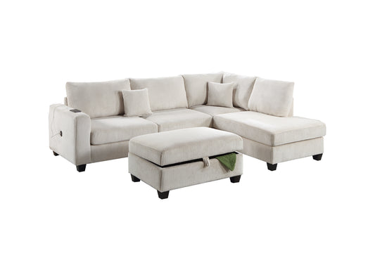 Ivory Color 3pc Sectional Set Corduroy Upholstered LAF Sofa RAF Chaise Ottoman L-Sectional Living Room Furniture