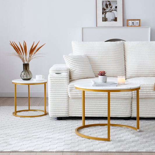 Set 2 Coffee Table Nesting White and gray top Golden Frame Circular Round and Marble Pattern Wooden Tables, Living Room Bedroom Apartment Modern Industrial Simple Nightstand