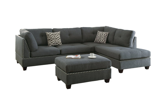 3-pcs Sectional Sofa Black Polyfiber Cushion Sofa Chaise Ottoman Reversible Couch Pillows