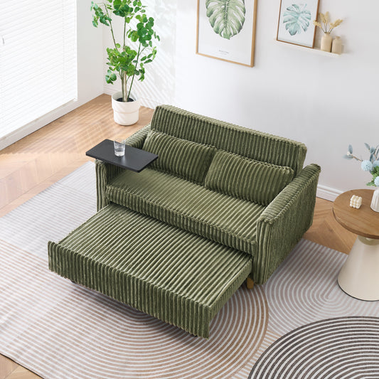 The pull-out and push-in green corduroy sofa with dual functions, equipped with a movable tabletop and USB ports, is suitable for use in living rooms and bedrooms.