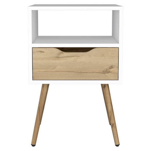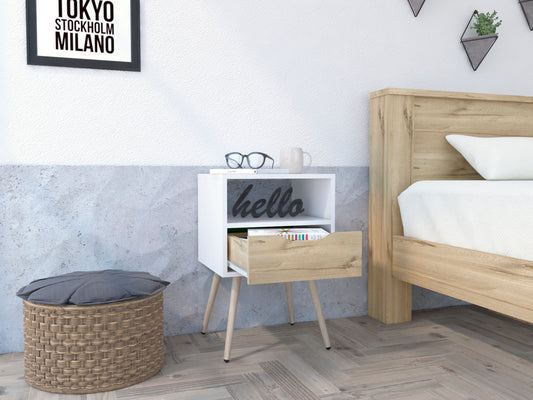 Otom Nightstand , Superior Top, One Open Shelf, One Drawer, Four Legs -White / Light Oak