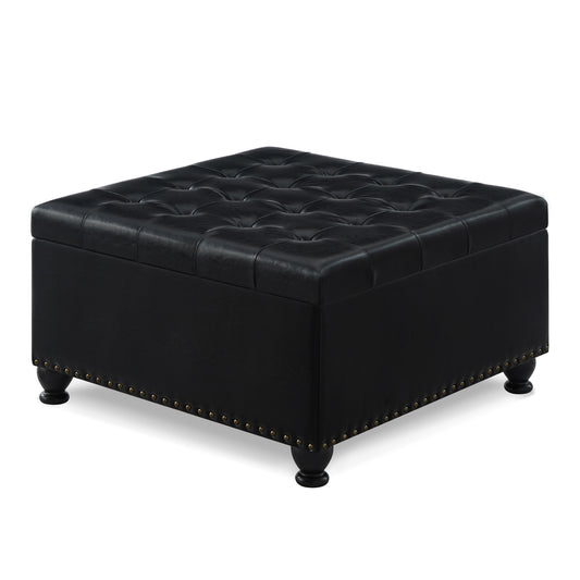 Large square storage ottoman with wooden legs, Upholstered button tufted coffee table with nail trims for Living Space, Black