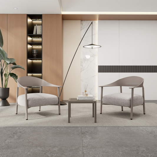 Furniture Set with Seat Cushions, Sturdy and Durable, in Warm Grey. Dimensions: 29.13*25*29.53 (in)/19.69*19.69*14.96 (in). Chair Body made of Plywood, Powder-coated Metal Legs, and PP Table.