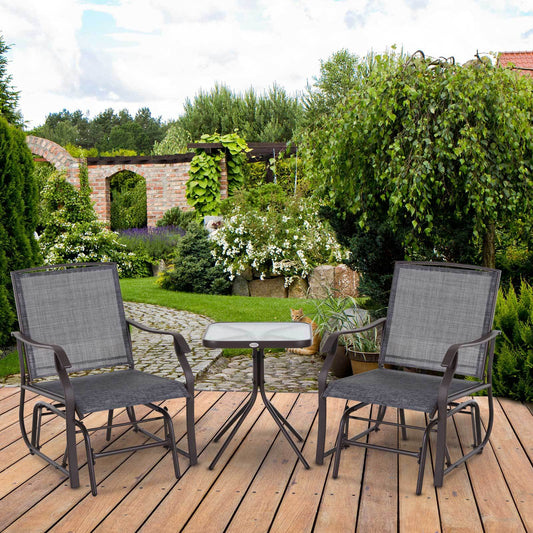 Outsunny 3 Piece Outdoor Glider Chair with Coffee Table Bistro Set, 2 Patio Rocking Swing Chairs with Breathable Sling Fabric, Glass Tabletop, for Backyard, Garden and Porch, Gray