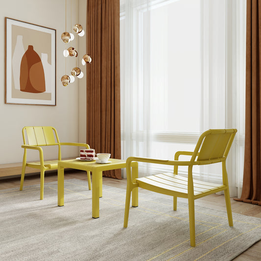 Three-piece indoor/outdoor leisure table and chair set (two chairs and one coffee table), UV-resistant, waterproof and durable, brick yellow, 25*20.47*27.56 (in)/19.69*19.69*14.96 (in), Polypropylene.