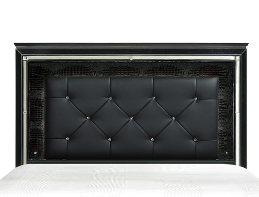 Black Finish Upholstered Button-Tufted 1pc Queen Size Bed LED Headboard Faux Alligator Embossed Textural Panels Wooden Bed