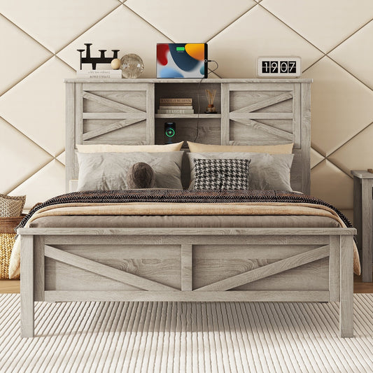 Farmhouse Platform Bed with Double Sliding Barn Door, Full Size Rustic Wood Bed with Charging Station, Wood Slats Support, Antique Gray