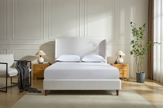 Hannah Upholstered Wingback Bed Size King / Tall 54" Headboard Upholstered King Bed / Premium Textured Canvas Chenille Look Ivory / Minimalist Designs / No Box Spring Needed / Easy Assembly / King