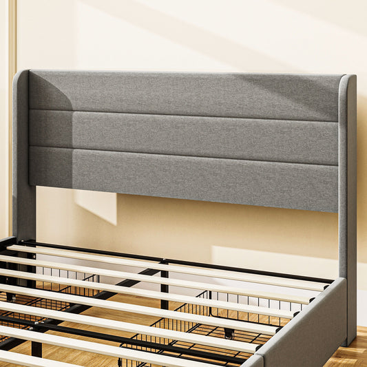 Iron Platform Bed Frame with Wooden slats support & Upholstered Headboard (Queen Size) - Grey