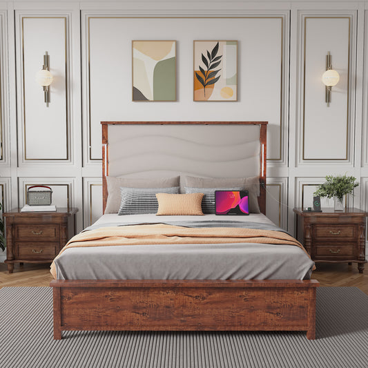 Queen Size Bed Frame with Upholstered Headboard , Queen Bed Frame with Charging Station and LED Lights, Wood Slats, Easy Assembly,No Box Spring Needed,Industrial Brown