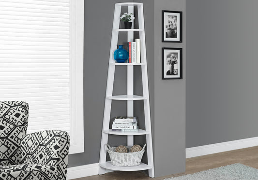 Bookshelf, Bookcase, Etagere, Corner, 5 Tier, 72"h, Office, Bedroom, White Laminate, Contemporary, Modern