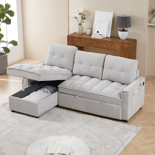 Toby 95" Gray Woven Fabric Reversible Sleeper Sectional Sofa with Storage Chaise Cup Holder Charging Ports and Pockets