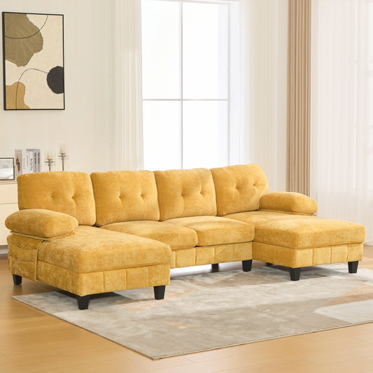 Modern U-Shaped Sectional Sofa with Dual Chaise Lounges, Storage Pockets and Armrest Pillows, Yellow Chenille Fabric, 103.5'