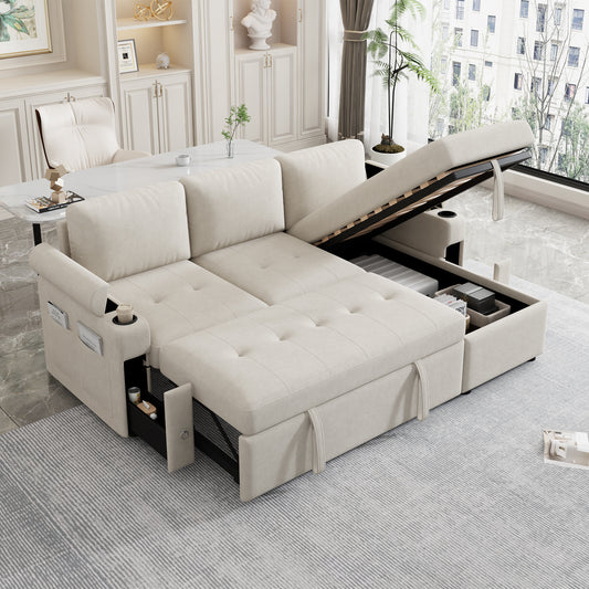 Beige U-shaped Sectional Sofa Pull Out Sofa Bed with USB Ports, Power Sockets, Back Pillows, Storage Chaise