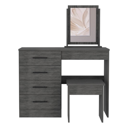 Kaia Makeup Vanity, Four Drawers, One Mirror, Stool -Smokey Oak