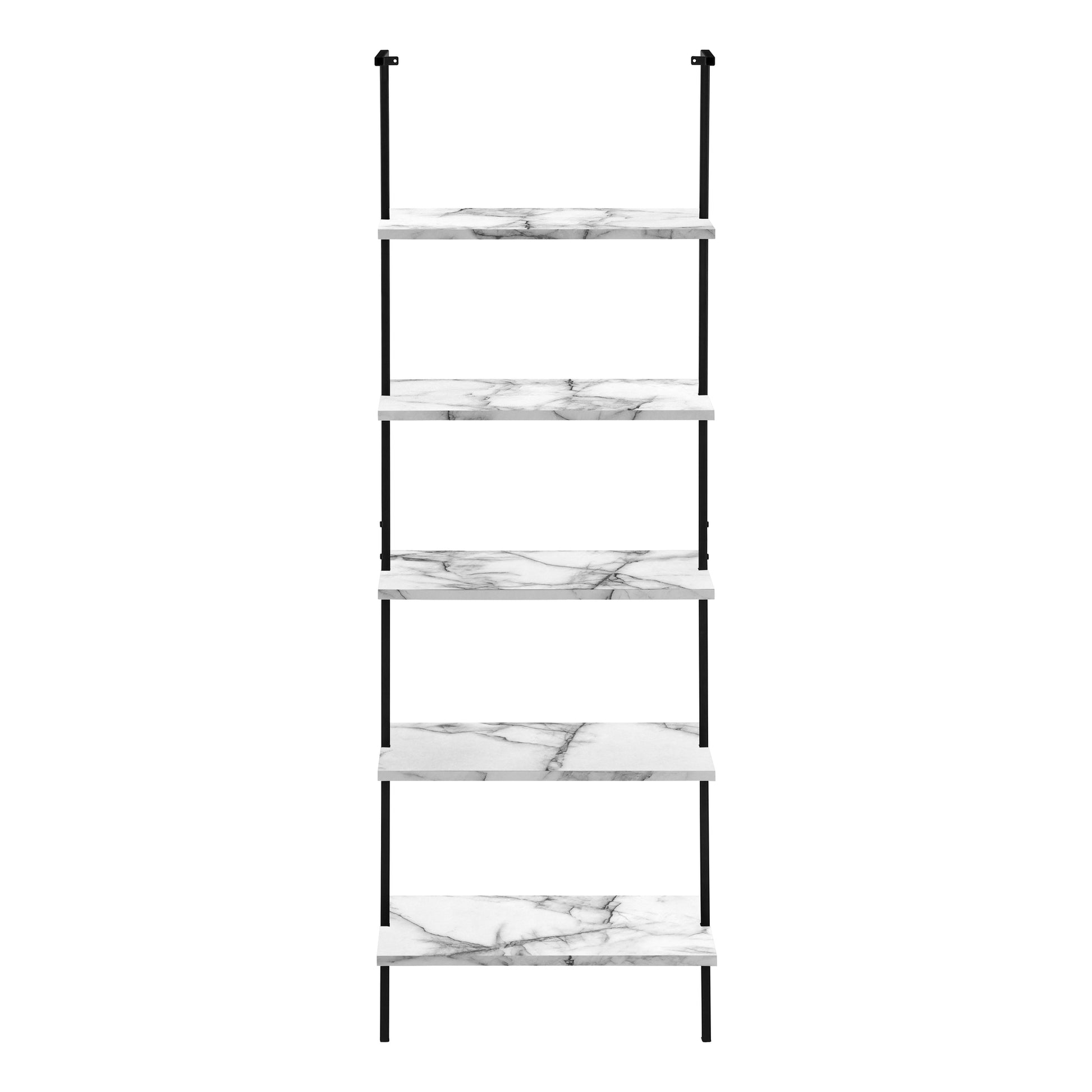 Bookshelf, Bookcase, Etagere, Ladder, 5 Tier, 72"h, Office, Bedroom, White Marble Look Laminate, Black Metal, Contemporary, Modern