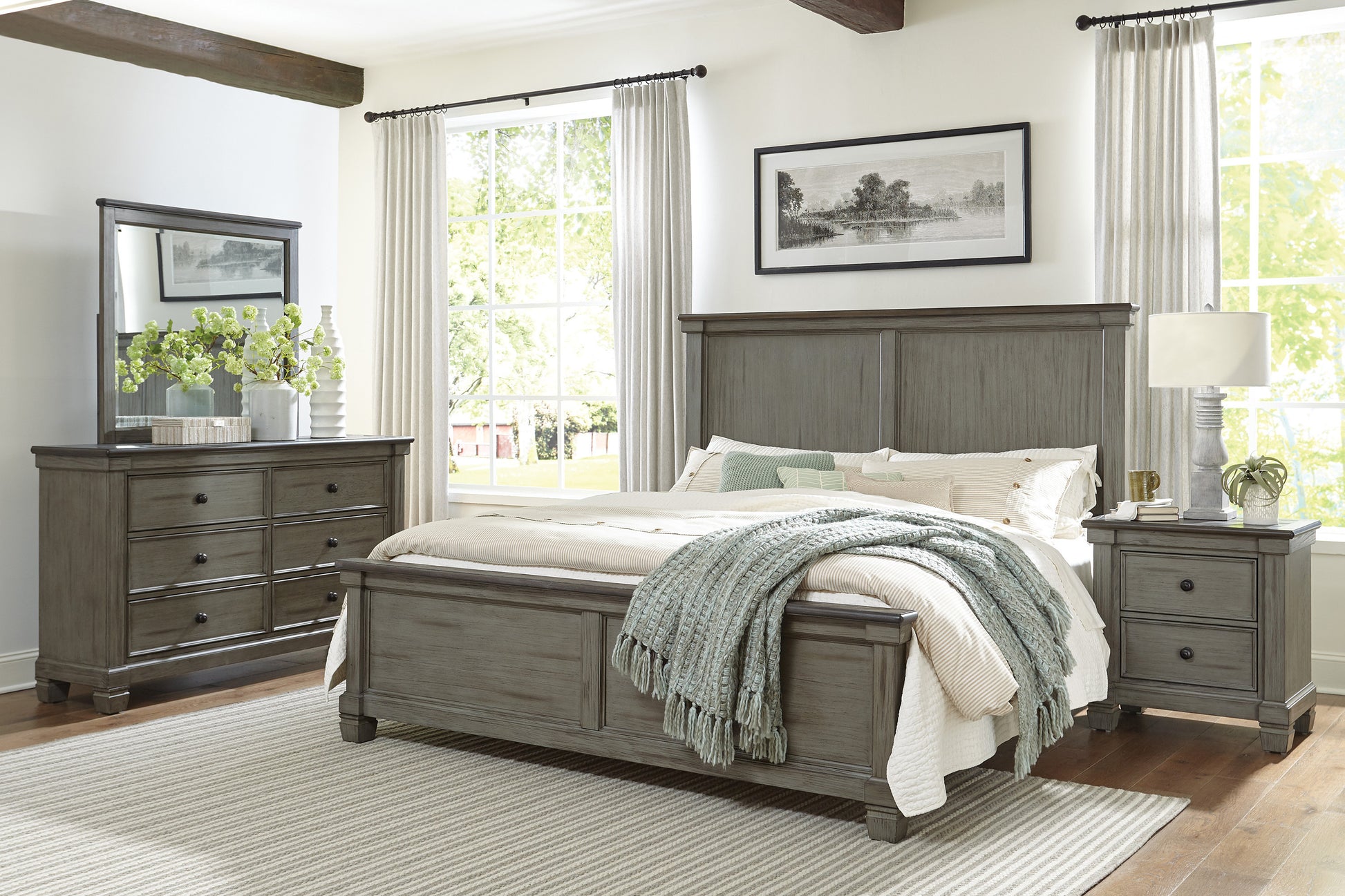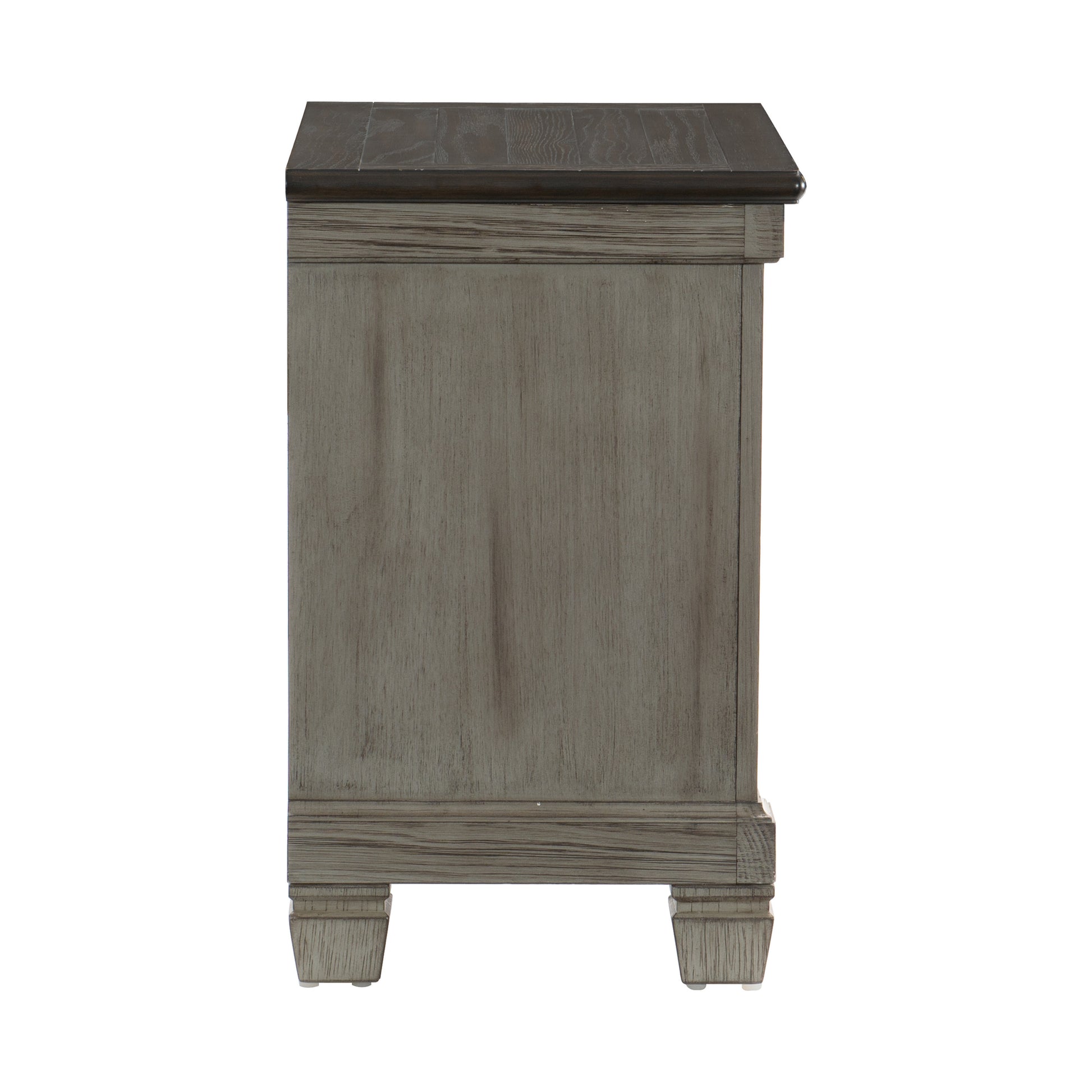 Transitional-rustic styling is expertly achieved in the design of the Weaver Collection. Antique gray provides bold contrast to the coffee-hued plank-style top of the nightstand, with pine solids and oak veneer further lending visual texture. Classic framing paired with dark metal knob hardware complete the rustic look.