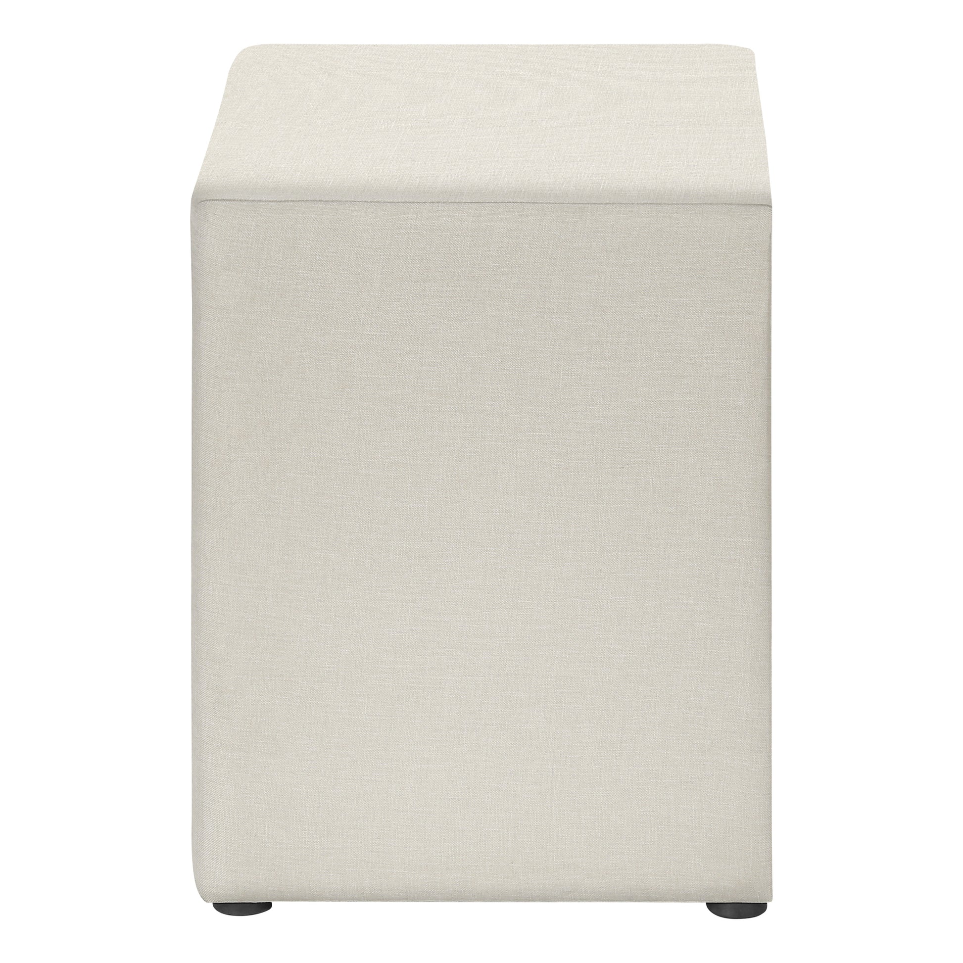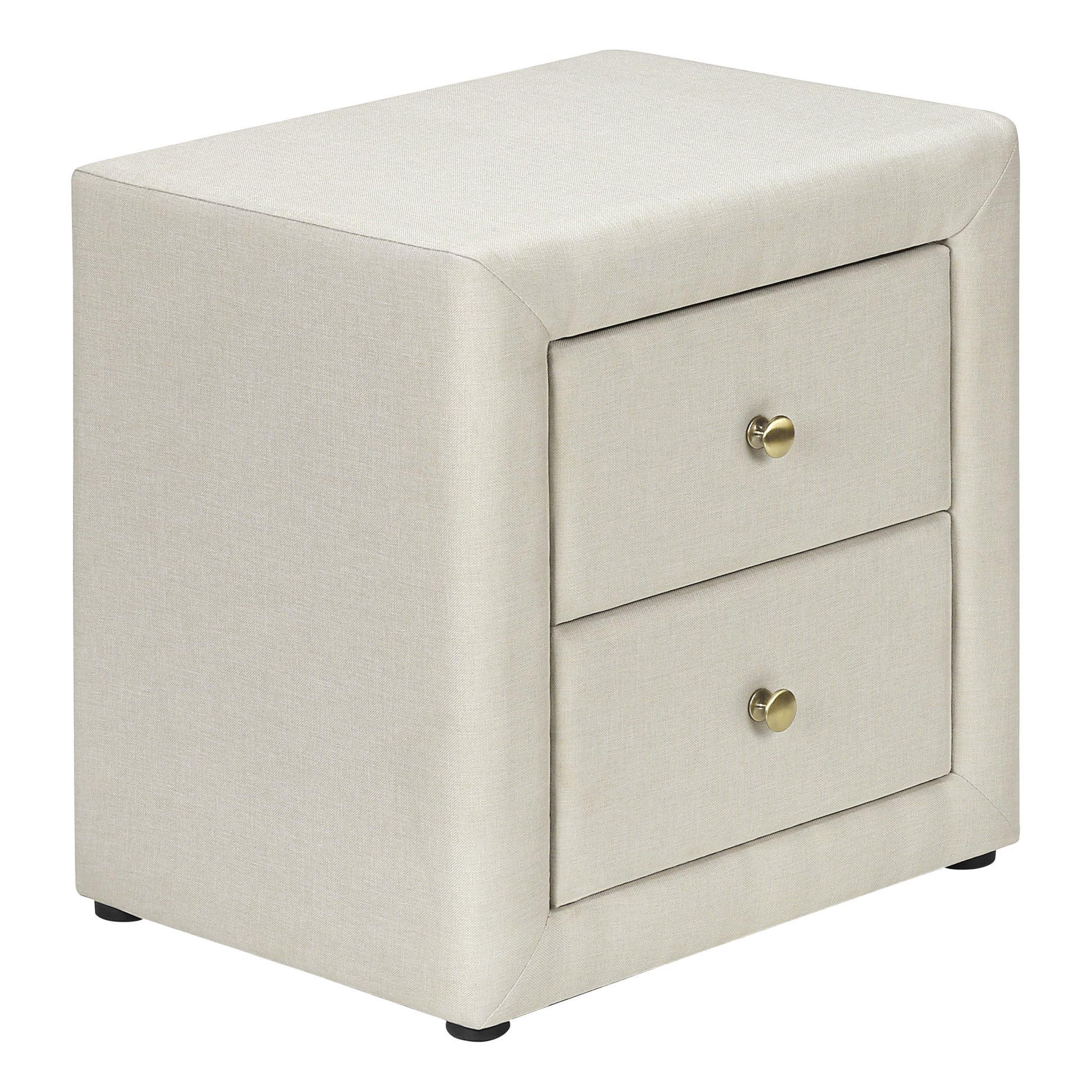 - Upholstered in beige linen-look fabric with a bronze-finished metal drawer knob
