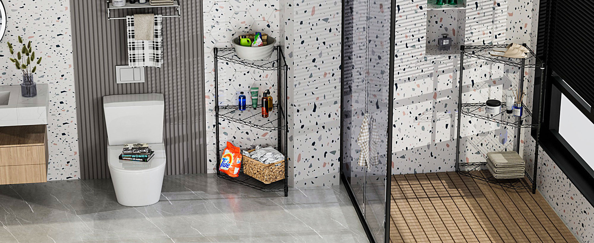 [SUTABLE FOR INSTALLATION IN THE CORNER] - Our 6-tier pentagonal corner storage rack is very suitable for placing in the corner, especially for places where space is limited and requires large storage space. Simple modern design is well coordinated with any family and store decoration style. For example, bathroom, door, entrance, garage, kitchen, kitchen, laundry room, office or closet.
