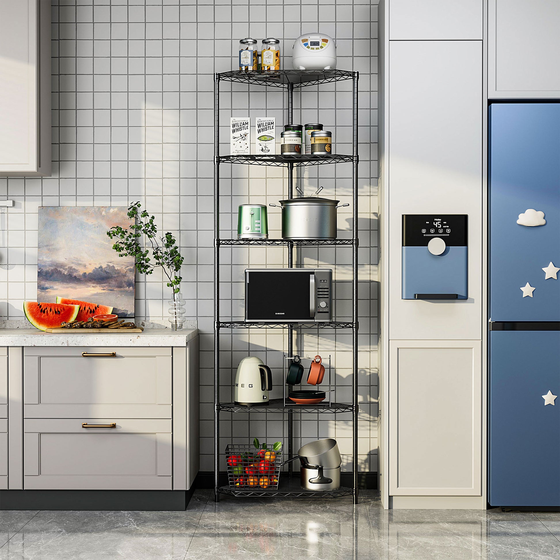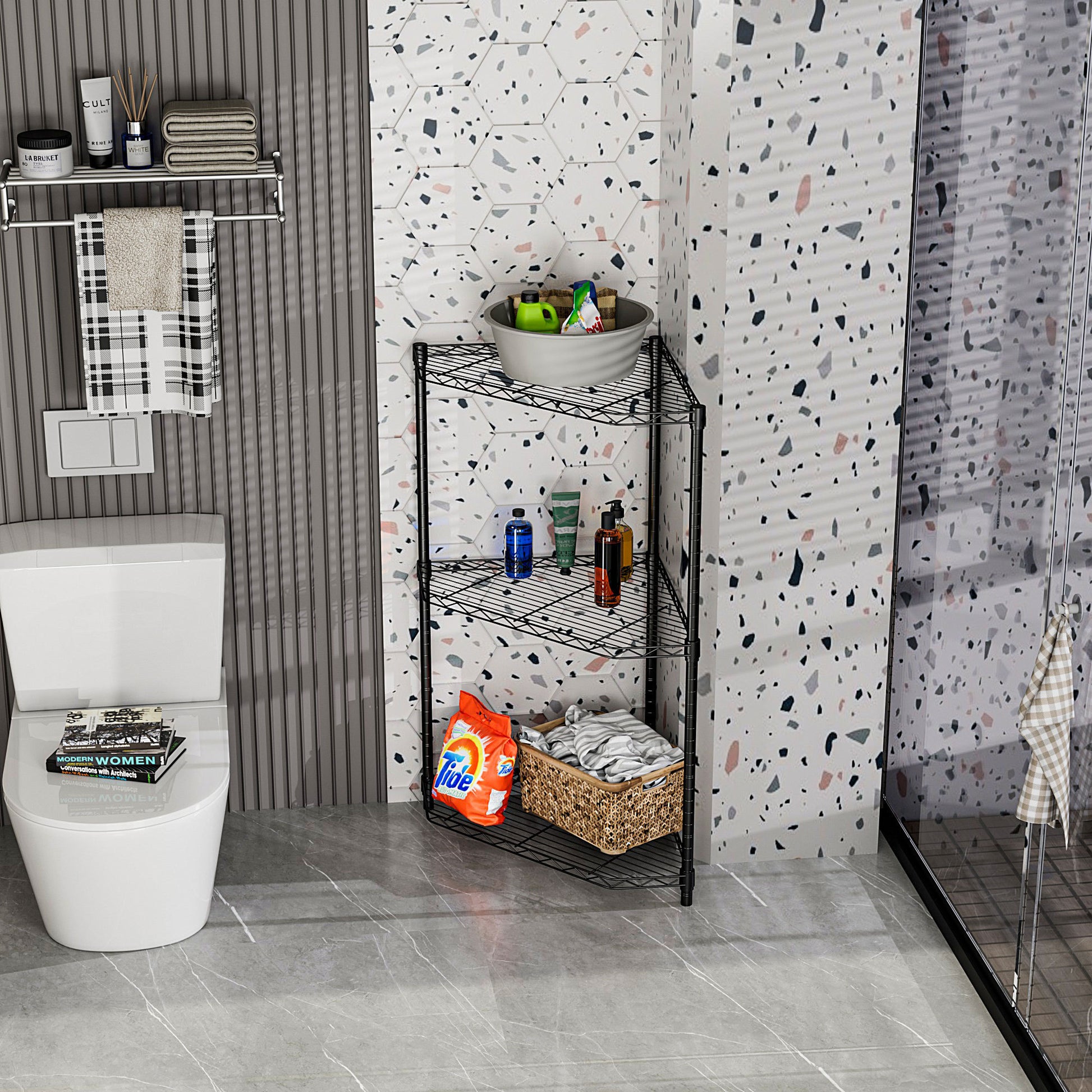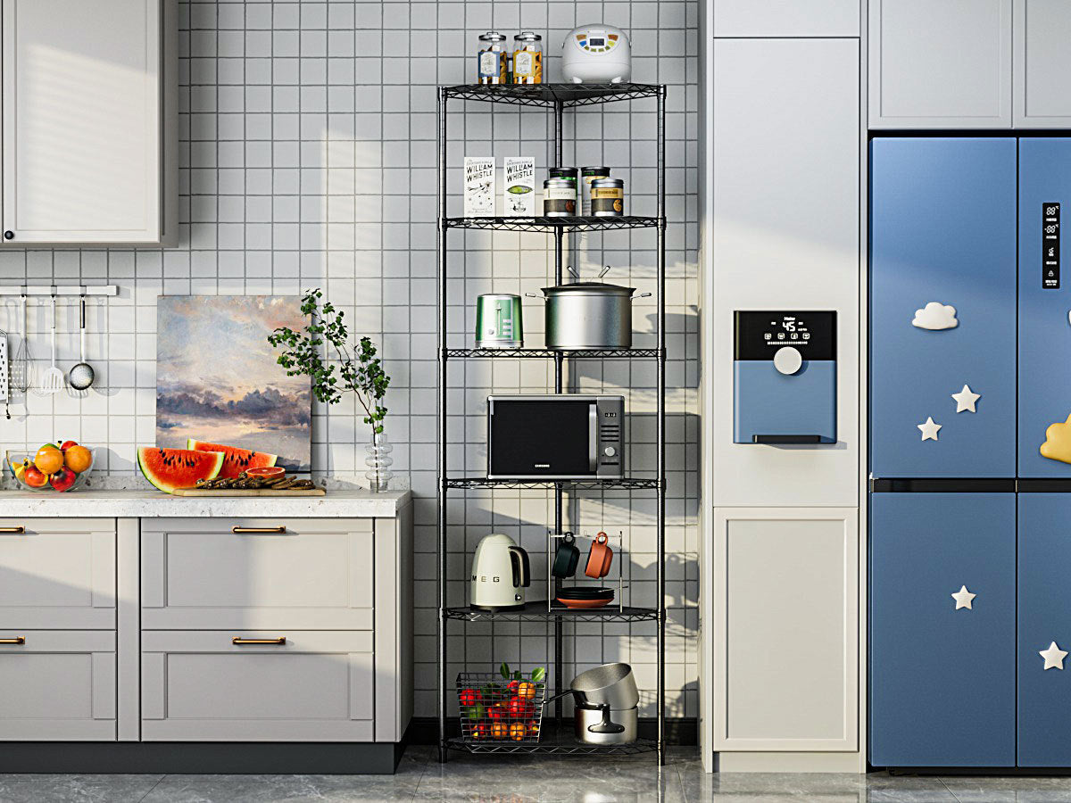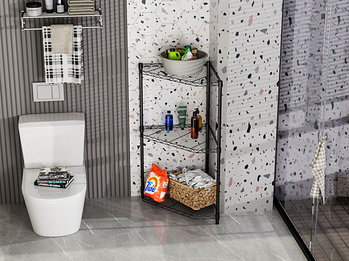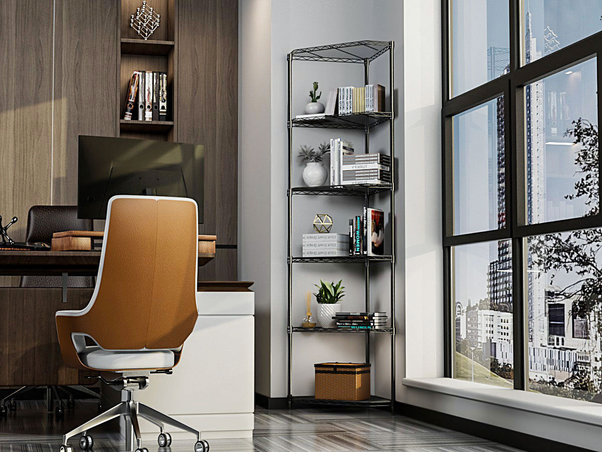 - [SUTABLE FOR INSTALLATION IN THE CORNER] - Our 6-tier pentagonal corner storage rack is very suitable for placing in the corner, especially for places where space is limited and requires large storage space. Simple modern design is well coordinated with any family and store decoration style. For example, bathroom, door, entrance, garage, kitchen, kitchen, laundry room, office or closet.