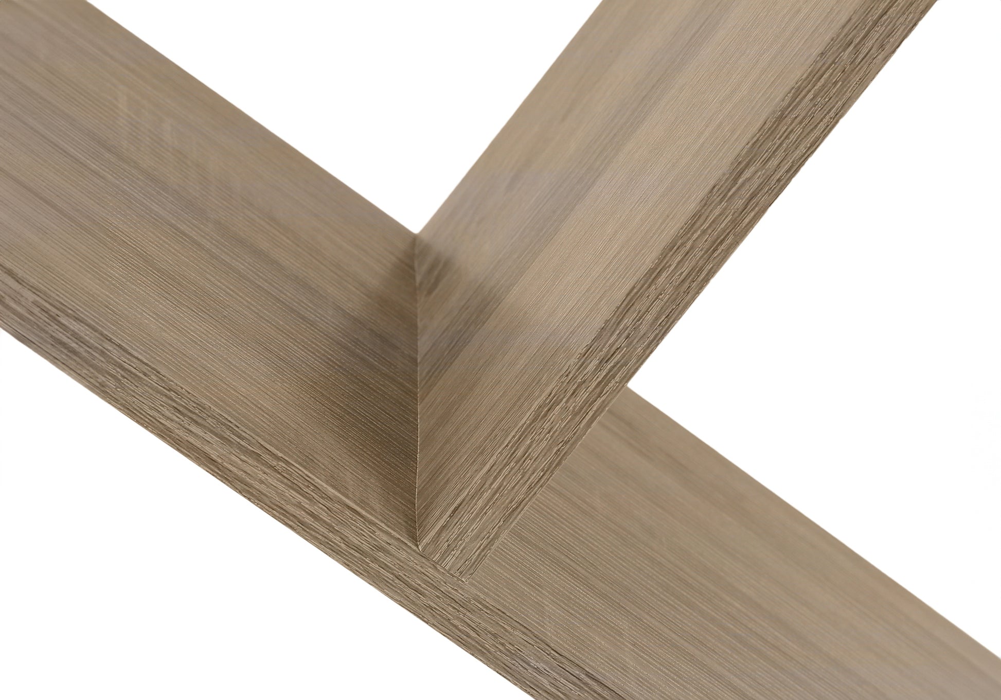 - Open shelves are finished on all sides in a dark taupe wood-look finish with a wood-grain texture