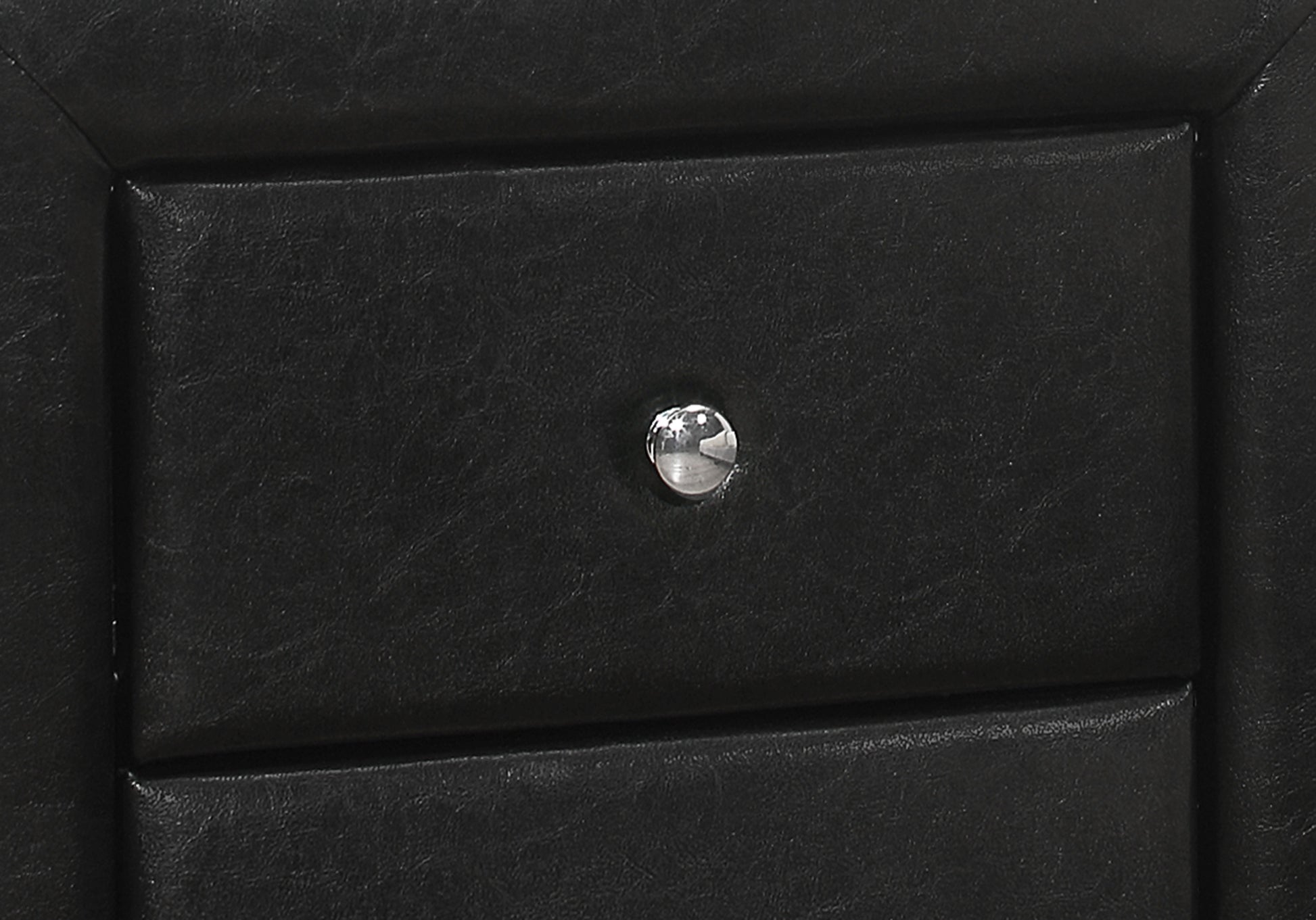 - Upholstered in black leather-look fabric with a chrome-finished metal drawer knob