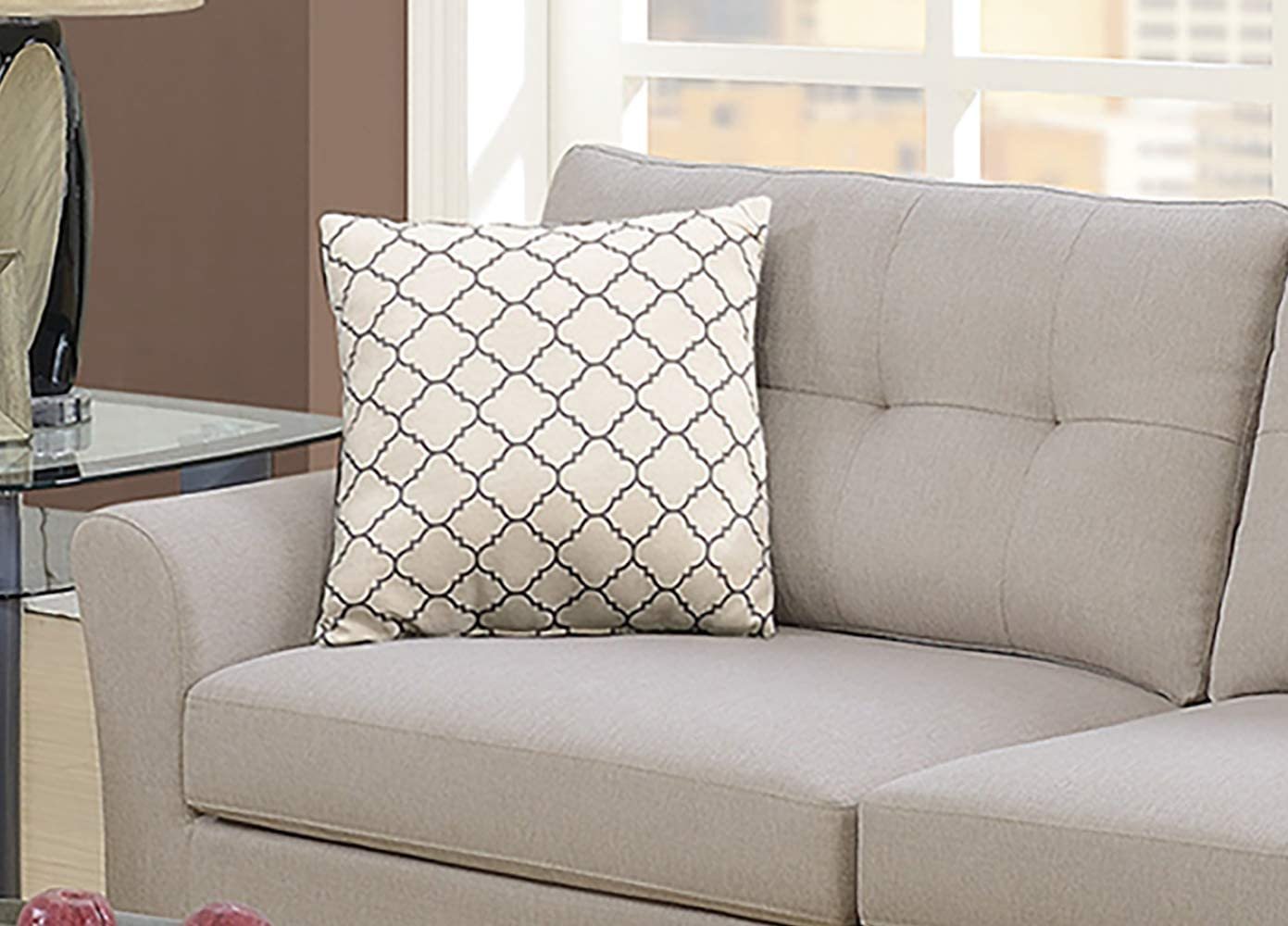 A perfect 2 piece sofa set to place in any living space will leads to a perfect furniture setting. Its construction involves the use of durable wood material comprising plywood base panel with solid pine frame draped in glossy polyfiber fabric in charcoal gray. This set comprises one loveseat and one sofa with contrasting accent pillows. Does not include table or any featured product other than one loveseat and one sofa with accent pillows.