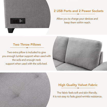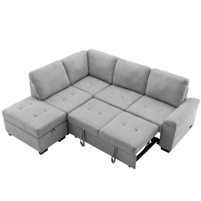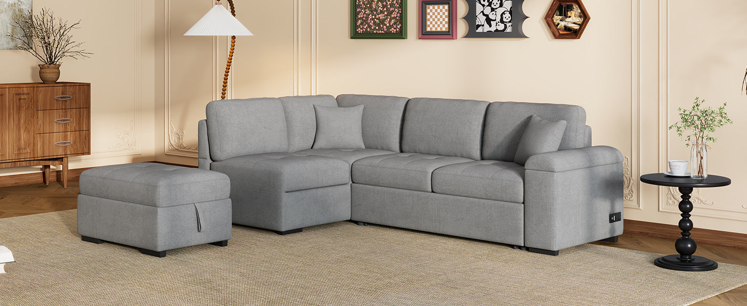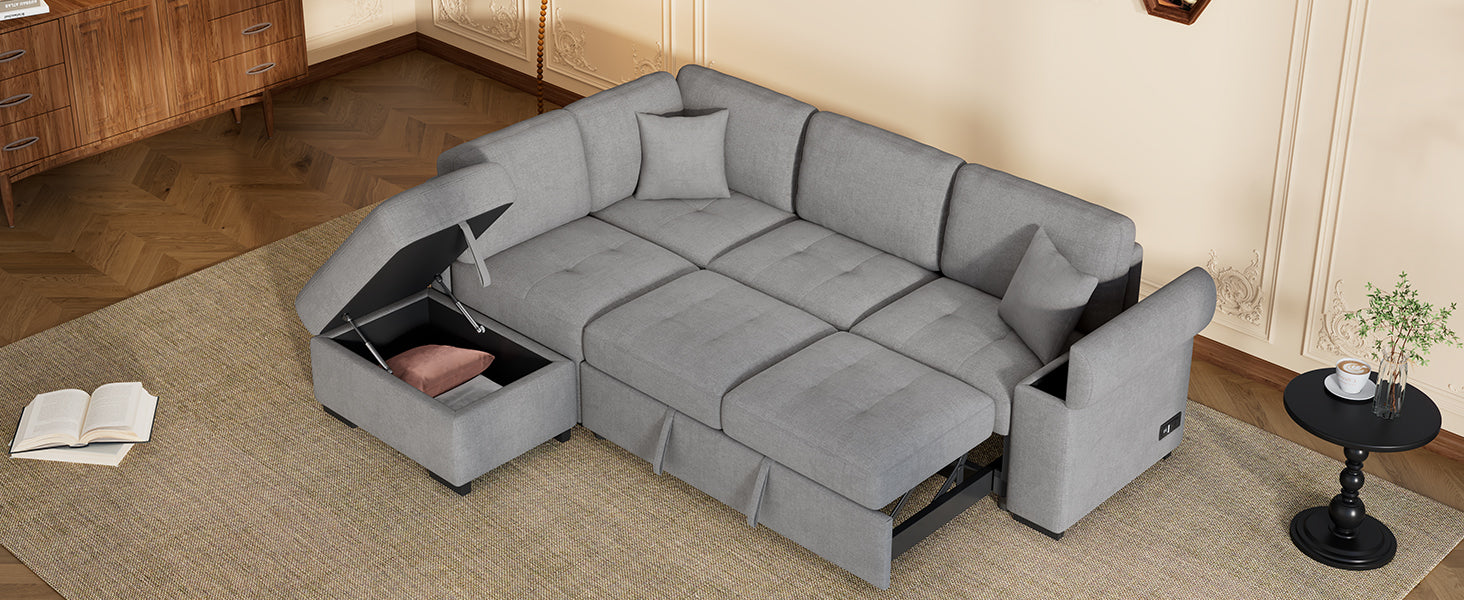 Sleeper Sectional Sofa, L-Shape Corner Couch Sofa-Bed with Storage Ottoman & Hidden Arm Storage & USB Charge for Living Room Apartment, Gray