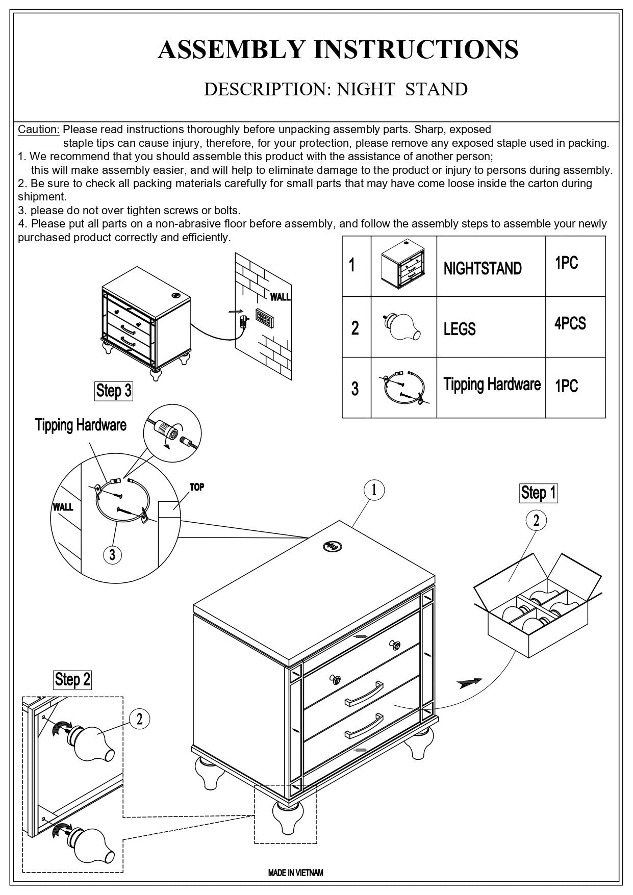 Description :- The perfect companion for your bedside needs, crafted with attention to detail, this nightstand offers ample storage space for your nighttime essentials. The top drawer is adorned with round handles for a classic touch, while the bottom drawer boasts sleek handles with a unique design, adding a touch of sophistication to your space. Never worry about tangled cords again with the built-in wireless charging station on the top of the nightstand. The front of the drawers is adorned with a chic snakeskin design, adding a touch of glamour to the piece. Plus, the front frame of the nightstand features mirror glass panels, creating an illusion of space and adding a touch of luxury to your bedroom. Supported by round gourd-shaped legs, this nightstand exudes elegance and stability. Upgrade your bedroom aesthetic by pairing it with the matching, Dresser, Mirror, Chest, and Bed Frame.