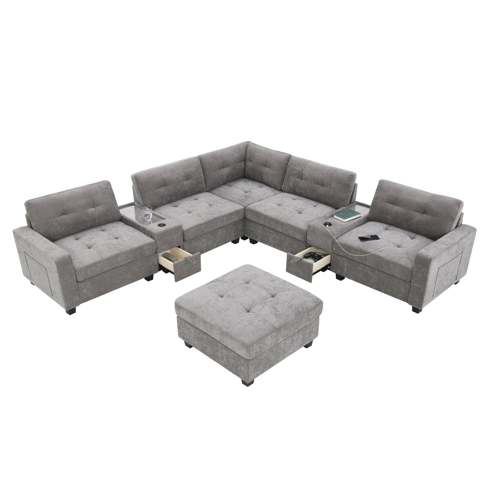 104'' Sectional Sofa with Acrylic Table Top,Chenille U Shaped Couch Set with 2 Consoles,USB Charger,Storage Drawers and Pockets,Movable Ottoman,Tufted Sofa for Living Room,Apartment,2 Colors