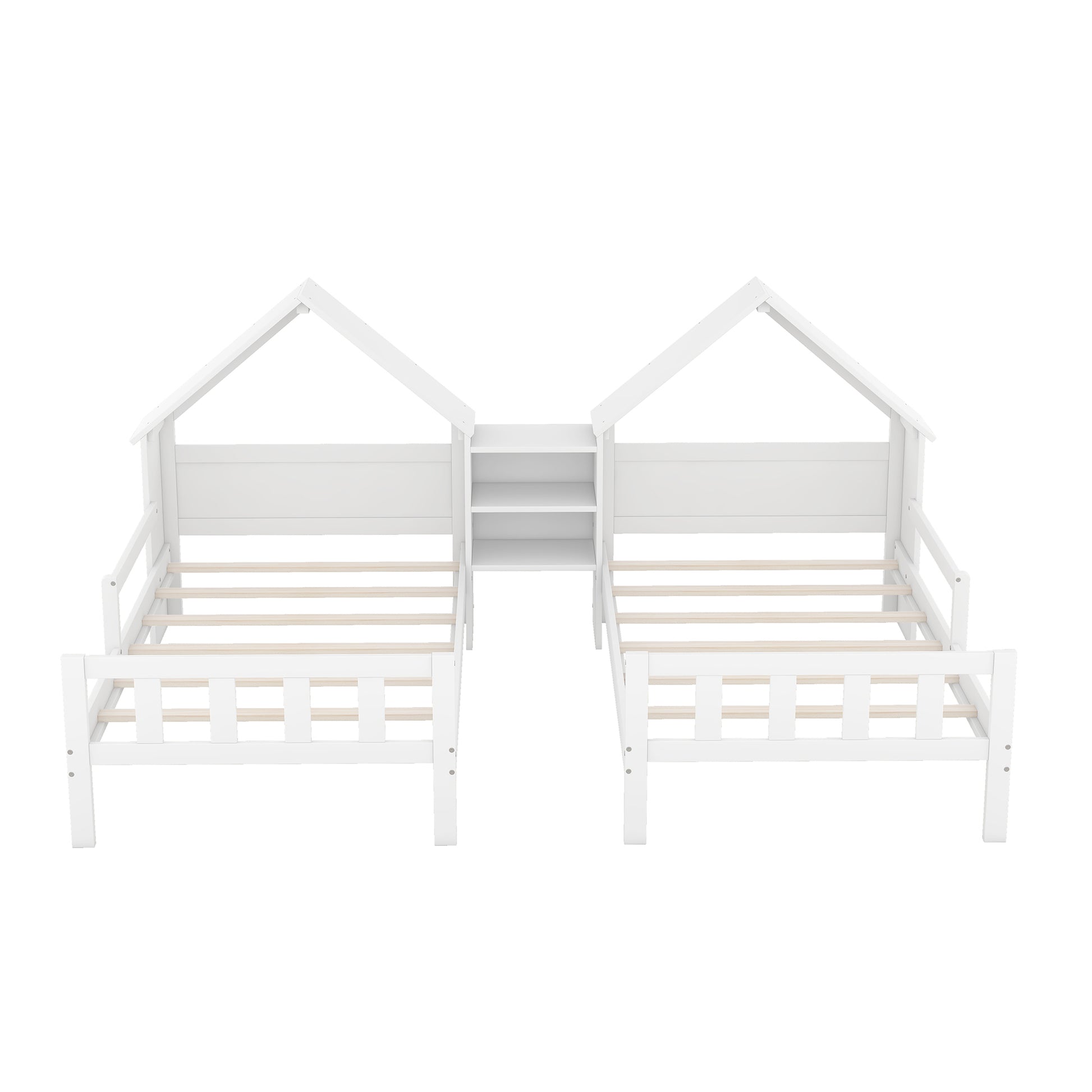 Double Twin Size Platform Bed with House-shaped Headboard and a Built-in Nightstand, White