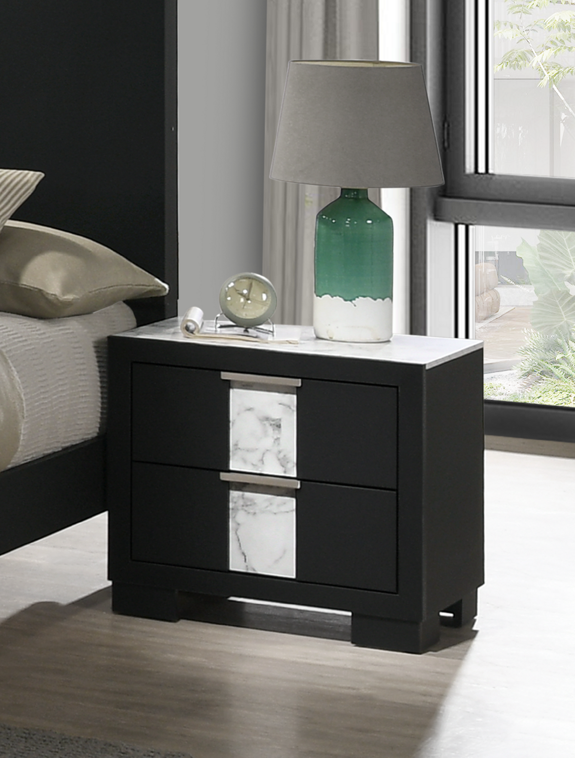 Include additional storage in your bedroom area with this nightstand from this collection, It has 2 drawers and a wood case finished in a black finish. Make a bold statement by incorporating this nightstand into your home.