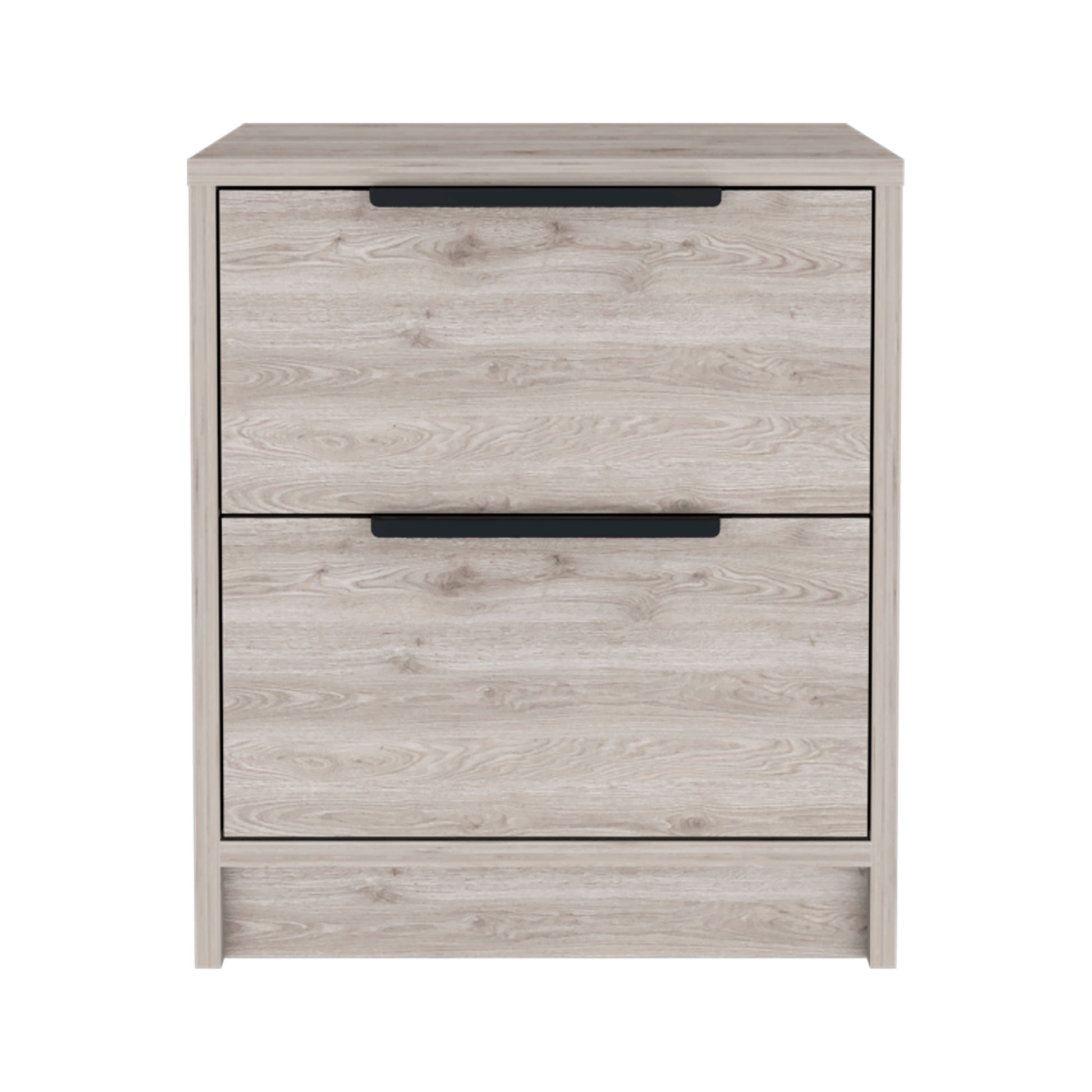 This clean and compact two-drawer nightstand is a stylish upgrade for your bedroom, featuring ample storage and sleek, slender bar drawer handles. With its contemporary design, it provides the extra storage space you need next to your bed.