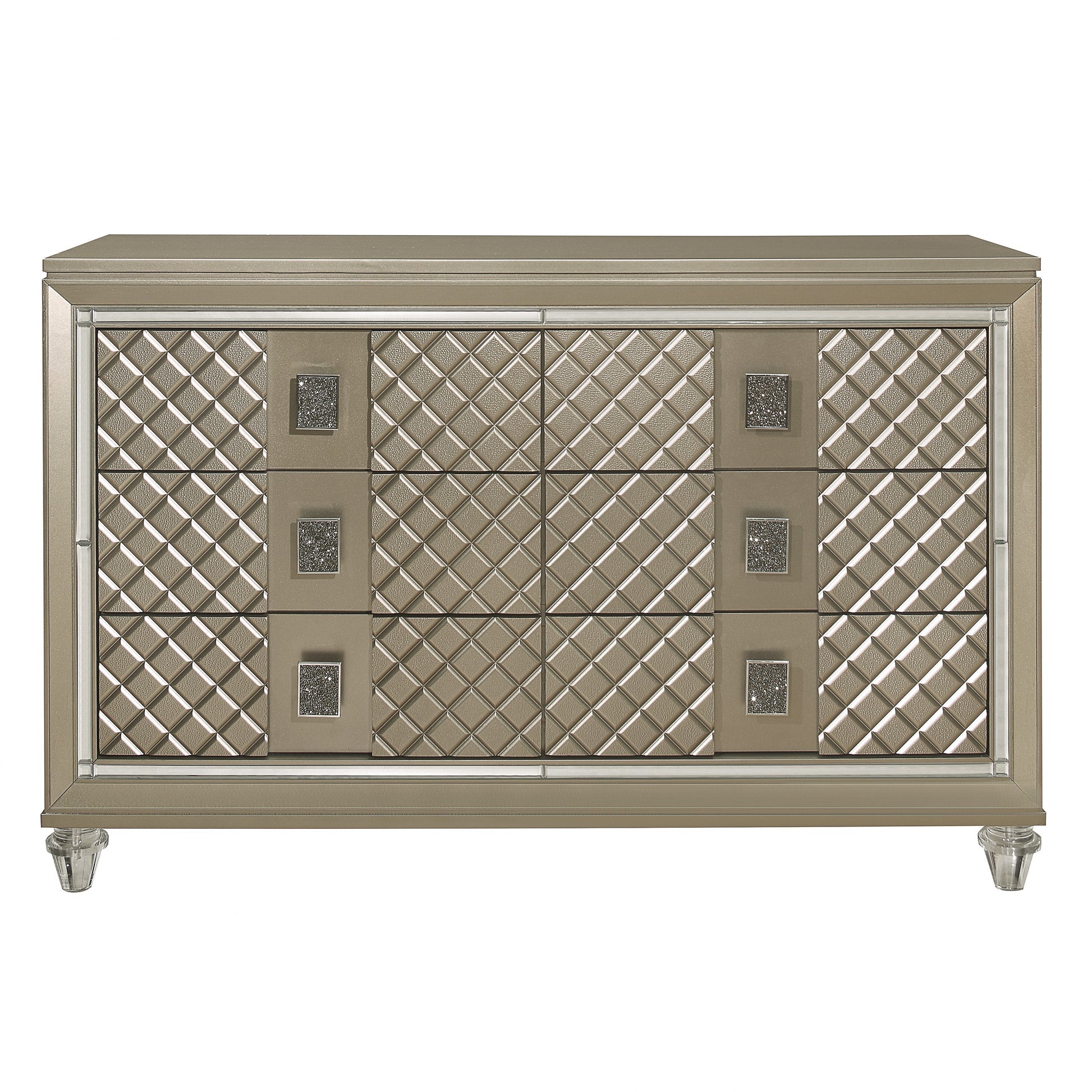 The glamour girl in your life will love the addition of the Loudon Collection to her bedroom. The champagne finish of the dresser shimmers while additional sparkle comes in the form of the black encrusted drawer pulls, embossed diamond pattern accent, mirrored framing and acrylic feet.