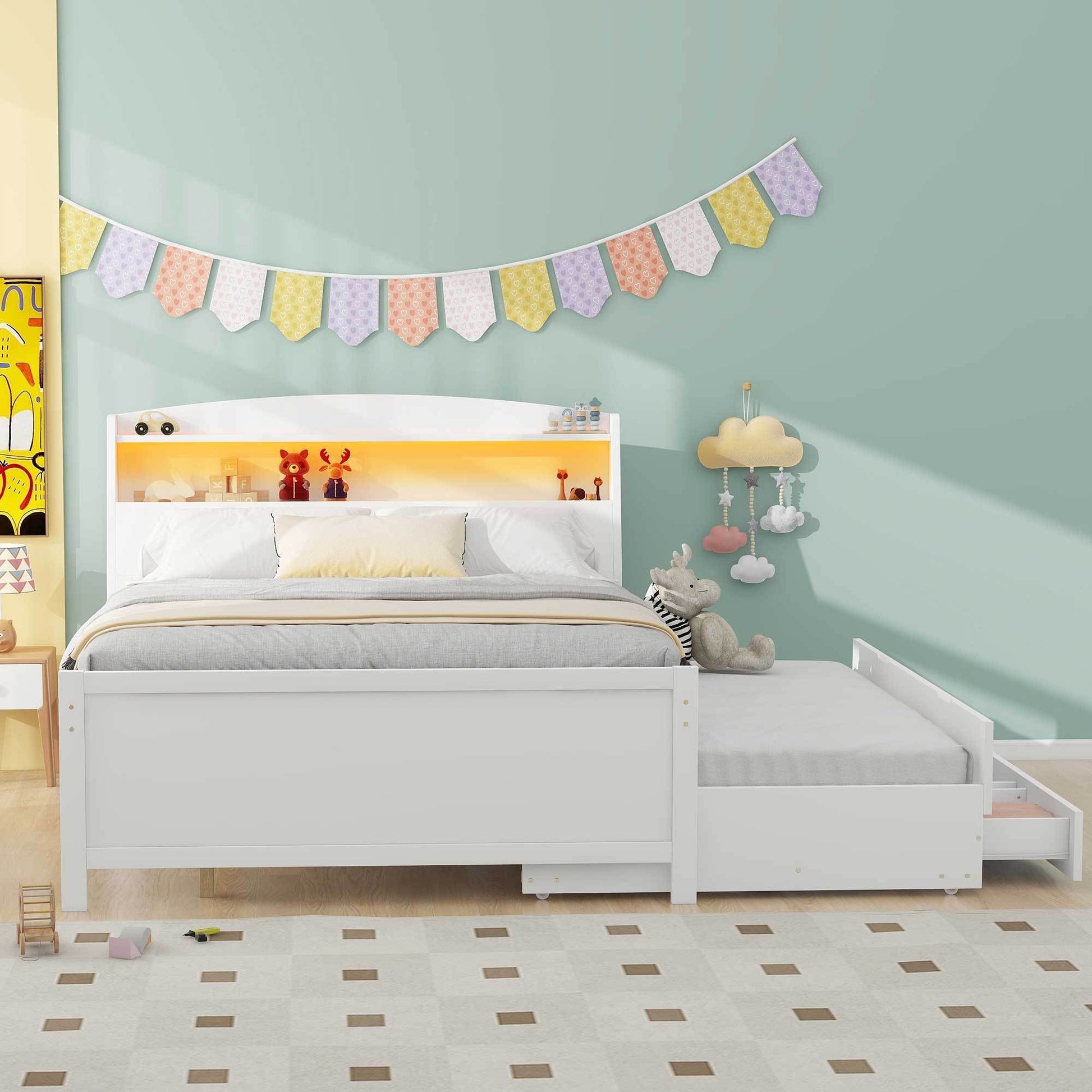 Full Size Platform Bed with Storage LED Headboard, Twin Size Trundle and 3 Drawers, White