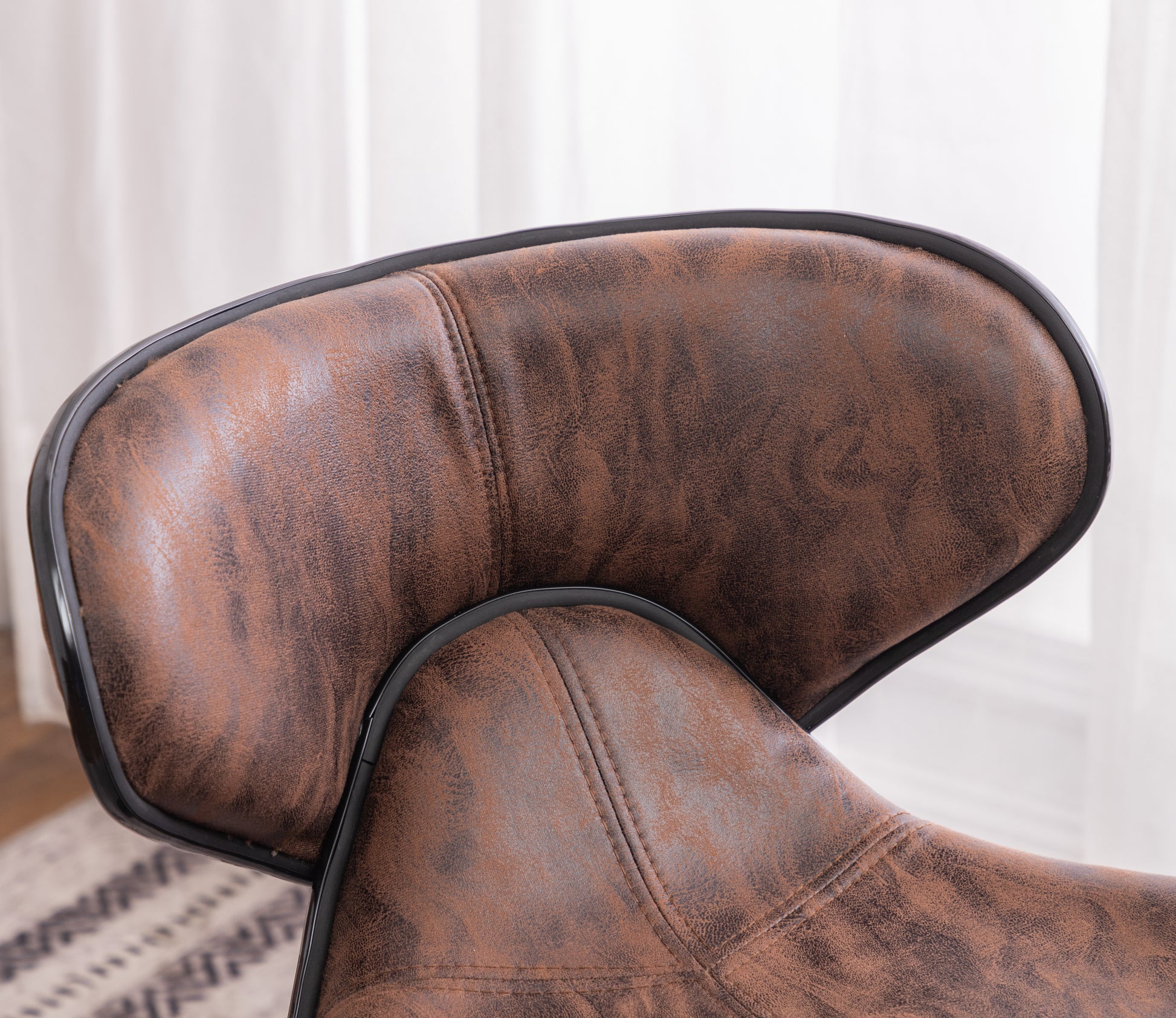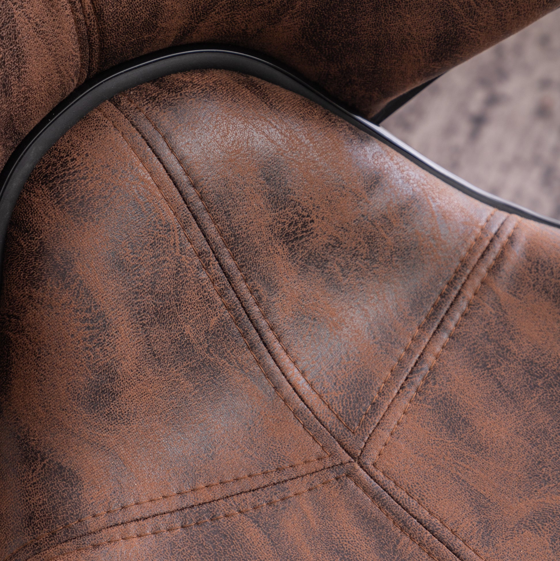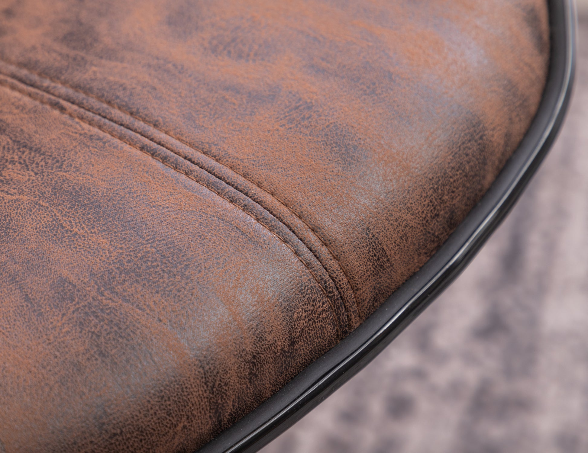 - High-quality foam covered by leather-look weathered polyester seat to added comfort. The seat features plush cushions with a black finished trim