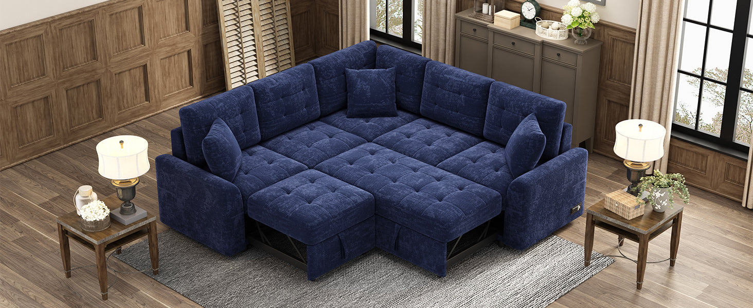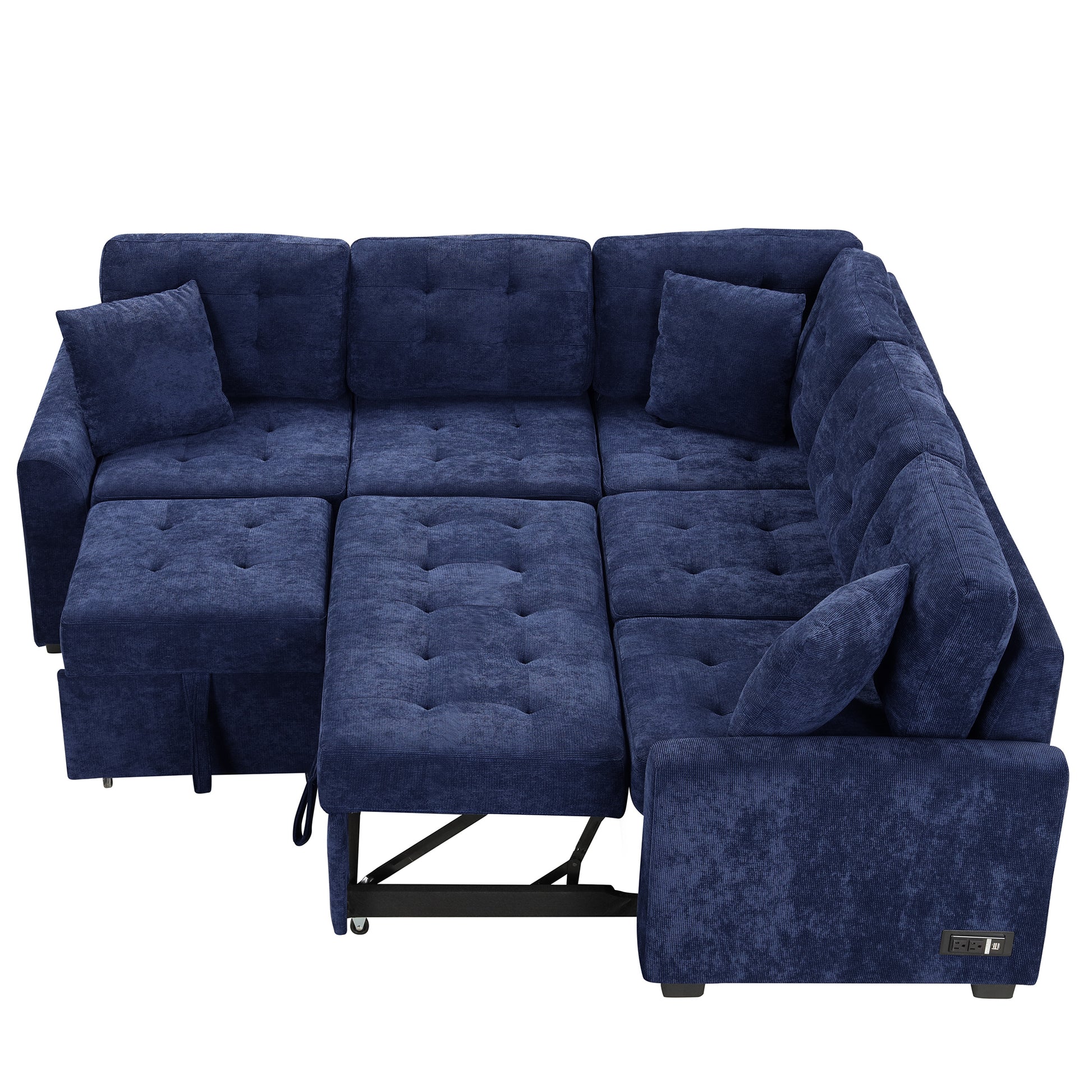 82.6" L-shape Sofa Bed Pull-out Sleeper Sofa with Wheels, USB Ports, Power Sockets for Living Room, Navy Blue