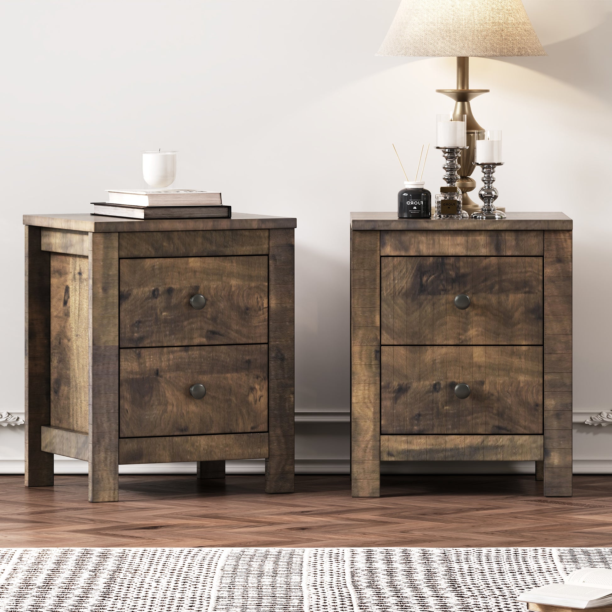 Farmhouse Wooden Nightstand Set of 2 with Retro Design, Wood Side Table with Storage Cabinet for Bedroom, Antique Walnut