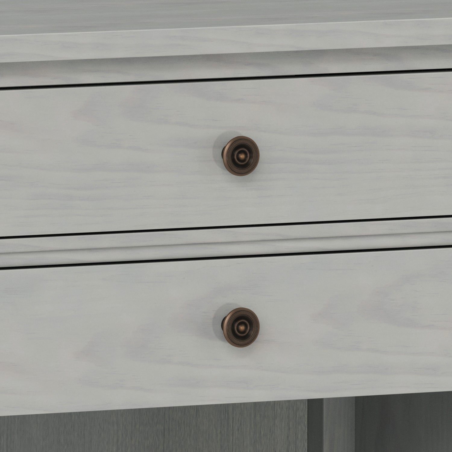 - Transitional design includes defined double molded top, tapered table legs, flat panel drawer fronts and antique bronze rounded decorative handles